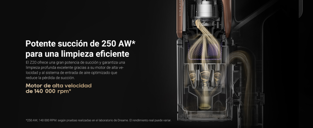 【Z20】Poderosa potencia de succión de 250 AW Experimenta un gran avance en eficiencia de limpieza con la Z20, que cuenta con una potente succión de 250 AW* y un motor sin escobillas de última generación...ver todo